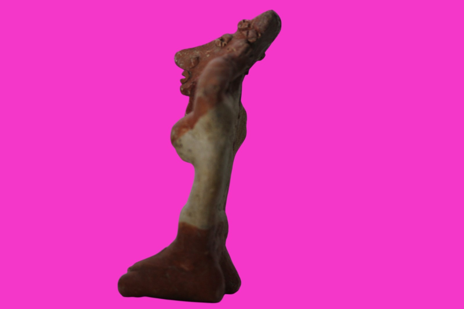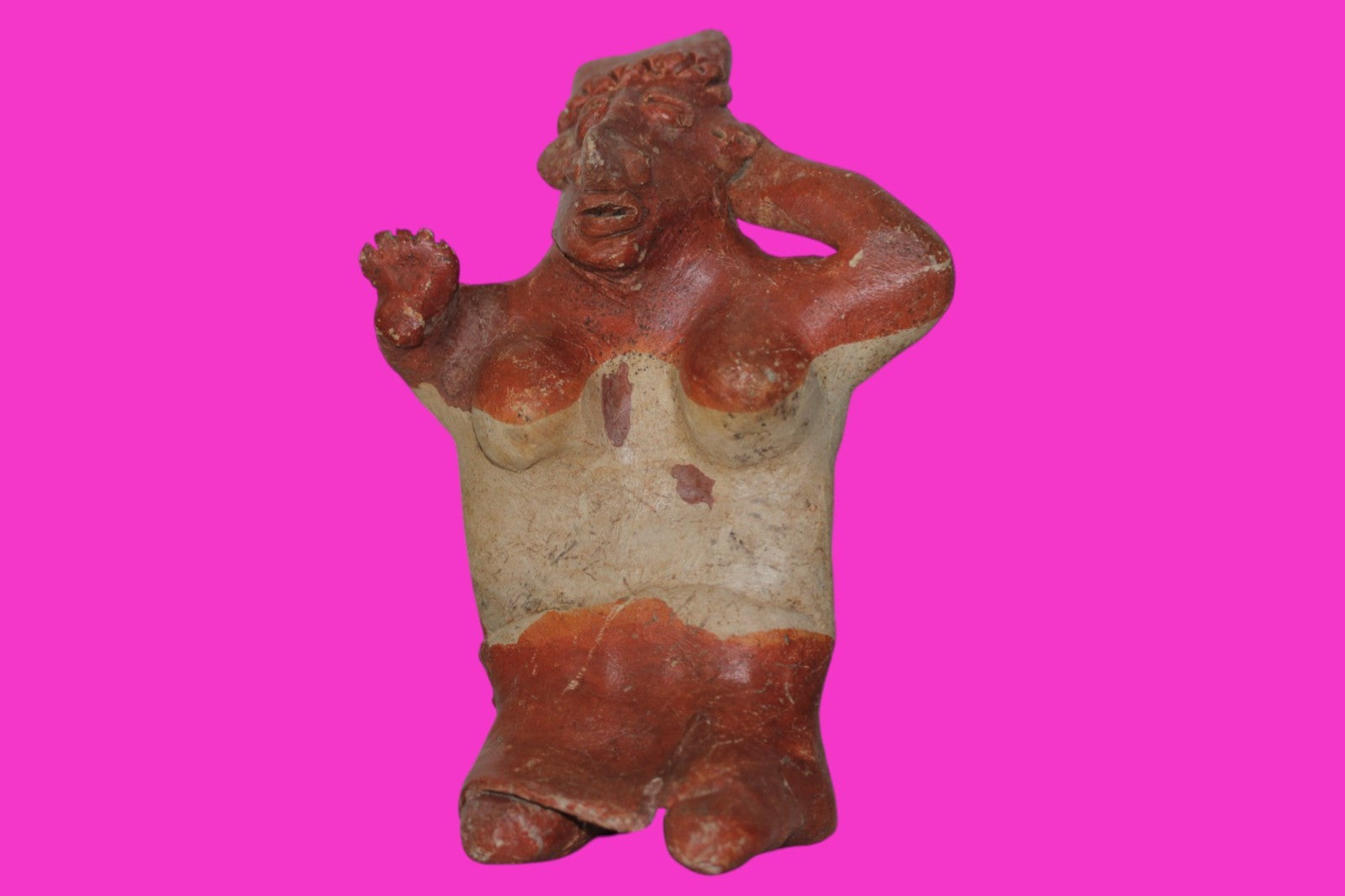 Dimensions: 6 ¼ inches tall, 4 ½ inches tall, weighs 362 grams.Description: Seated female solid pottery figure, red-orange over a cream slip, depicted with large breasts, holding her left hand to the back of her head, right hand held in a forward position, and wearing a knee length skirt. Wearing a crosshatched headband. Scattered mineral deposits and root marks indicative of several centuries of underground burial. A few spots of very minor paint wear, otherwise intact. Overall excellent condition.Provenance: Ex. Arte Primitivo Fine Art Gallery, Downtown Manhattan, New York City, Ex. Private California collection, Ex. Clifford Baker collection, San Diego, CA., collected 1960’s.