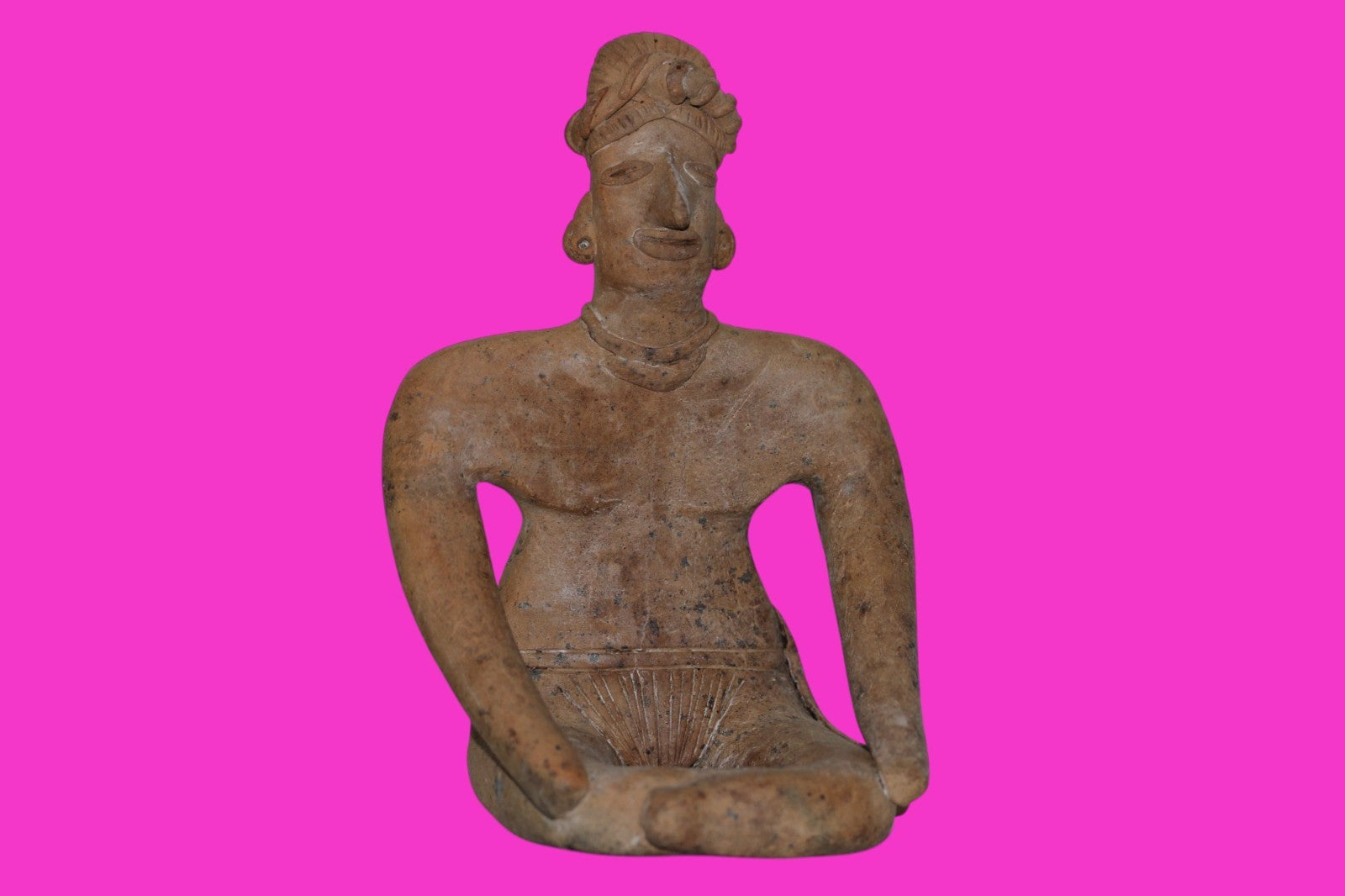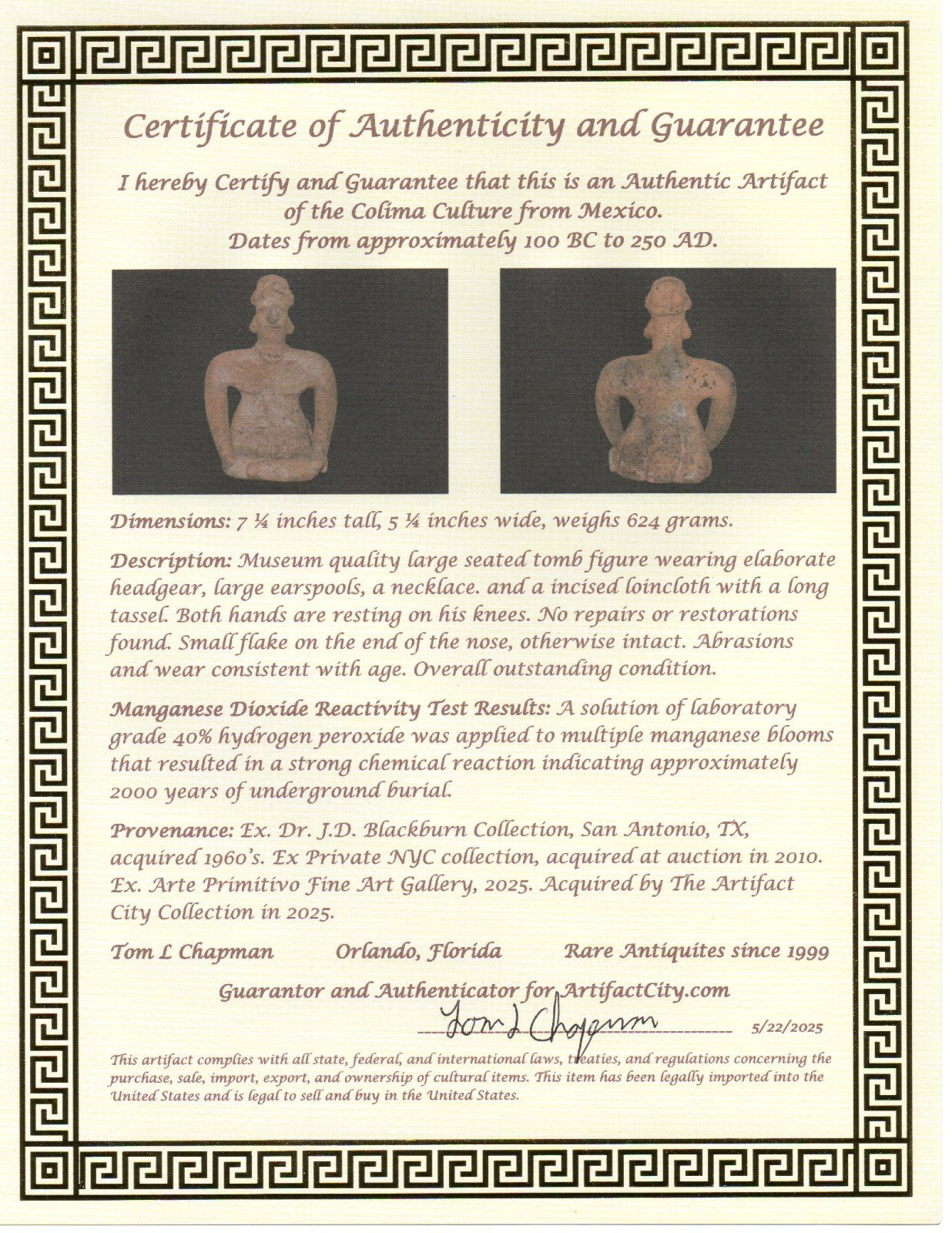 Dimensions: 7 ¼ inches tall, 5 ¼ inches wide, weighs 624 grams. Description: Museum quality large seated tomb figure wearing elaborate headgear, large earspools, a necklace. and a incised loincloth with a long tassel. Both hands are resting on his knees. No repairs or restorations found. Small flake on the end of the nose, otherwise intact. Abrasions and wear consistent with age. Overall outstanding condition. Manganese Dioxide Reactivity Test Results: A solution of laboratory grade 40% hydrogen peroxide was applied to multiple manganese blooms that resulted in a strong chemical reaction indicating approximately 2000 years of underground burial. Provenance: Ex. Dr. J.D. Blackburn Collection, San Antonio, TX, acquired 1960’s. Ex Private NYC collection, acquired at auction in 2010. Ex. Arte Primitivo Fine Art Gallery, 2025. Acquired by The Artifact City Collection in 2025.