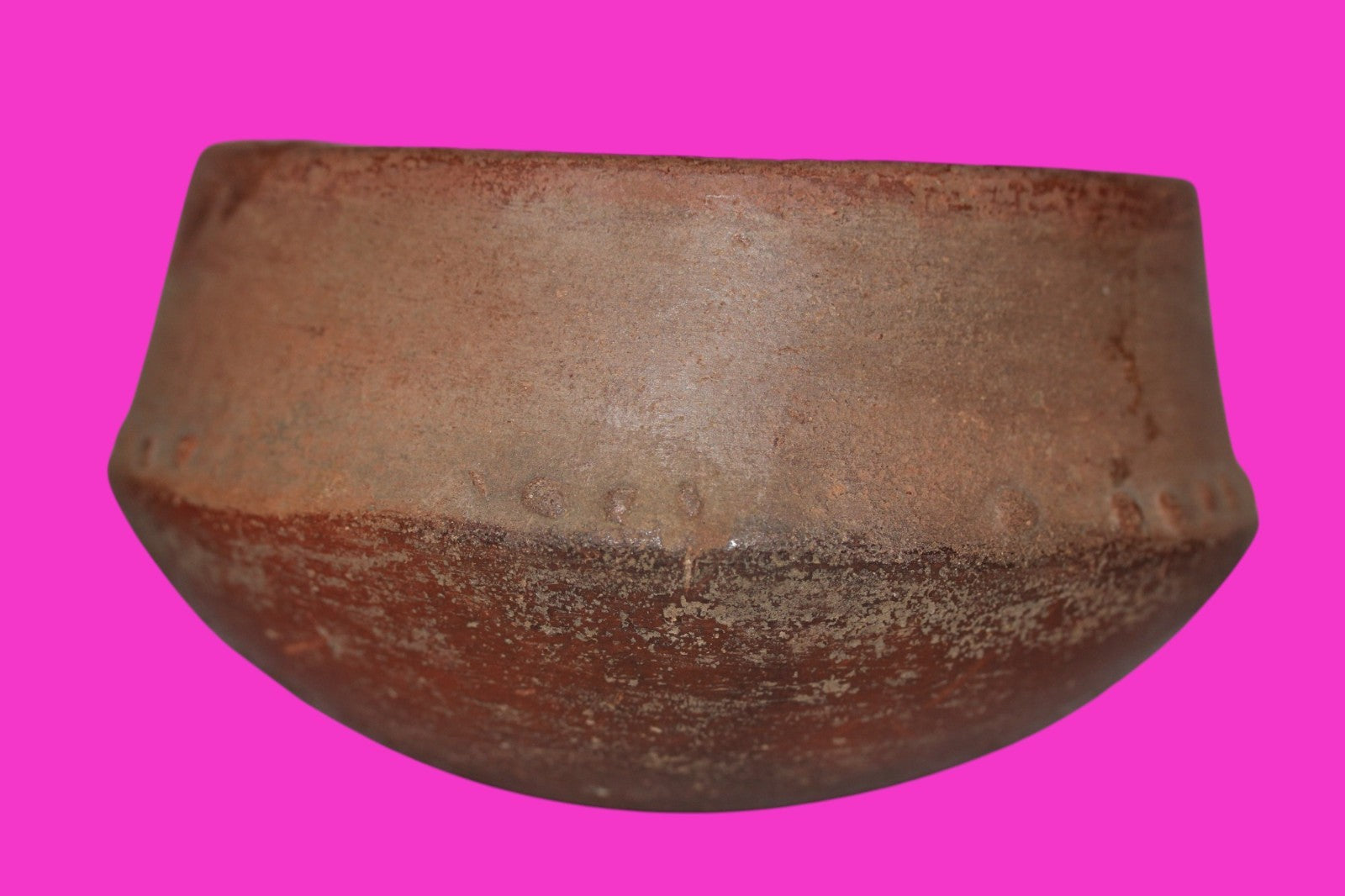 Dimensions: 2 ¾ inches tall, 5 ¼ inches wide, weighs 321 grams. Description: Redware bowl with decorative nodes around the circumference. Most likely used as a cooking pot as there is pitting on the inner surface. 1 inch professionally repaired rim section, otherwise intact. Abrasions & wear consistent with age. Overall excellent condition. Provenance: Ex. Private Los Angeles collection, acquired in the 1980’s. Acquired by John McIntosh, MSE, MBA of Ancient Artifacts & Treasures, Winter Park, Florida in 2010. Consigned to The Artifact City Collection in 2025.