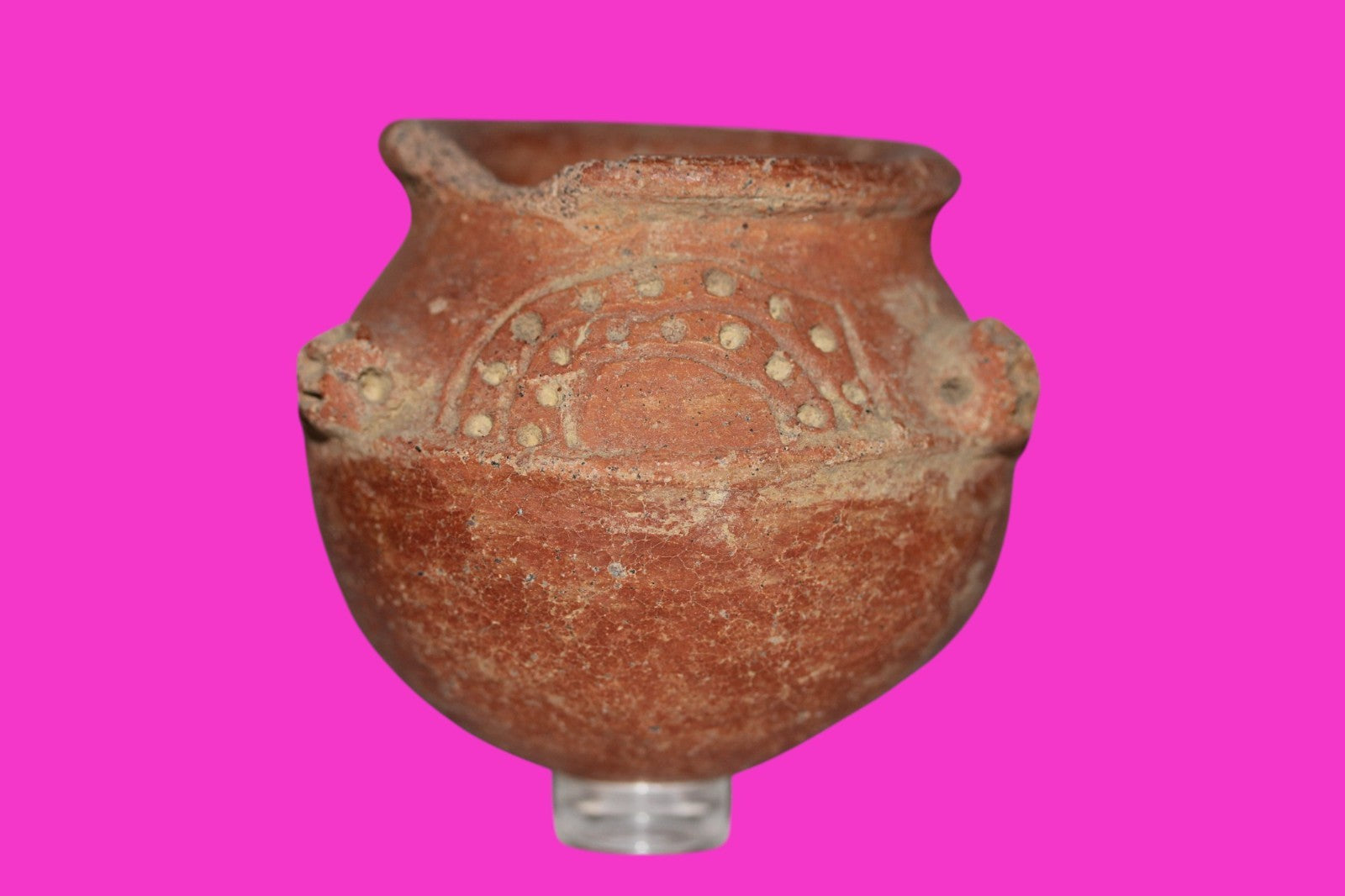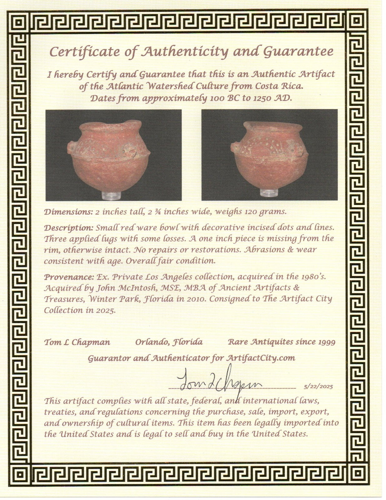 Dimensions: 2 inches tall, 2 ¾ inches wide, weighs 120 grams. Description: Small red ware bowl with decorative incised dots and lines. Three applied lugs with some losses. A one inch piece is missing from the rim, otherwise intact. No repairs or restorations. Abrasions & wear consistent with age. Overall fair condition. Provenance: Ex. Private Los Angeles collection, acquired in the 1980’s. Acquired by John McIntosh, MSE, MBA of Ancient Artifacts & Treasures, Winter Park, Florida in 2010. Consigned to The Artifact City Collection in 2025.